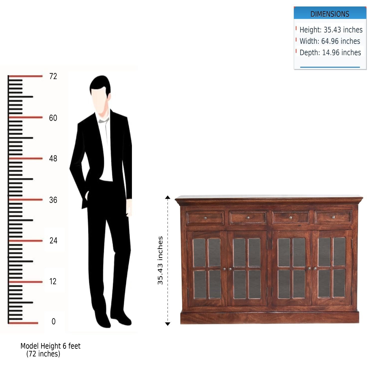 - Large Glazed Sideboard - This sideboard is made from 100% solid mango wood and has a smooth finish. This product offers excellent storage space with 4 drawers and 2 glazed door cabinets as well as a decent size top to place pictures and special ornaments etc. Add this stunning sideboard to your home.