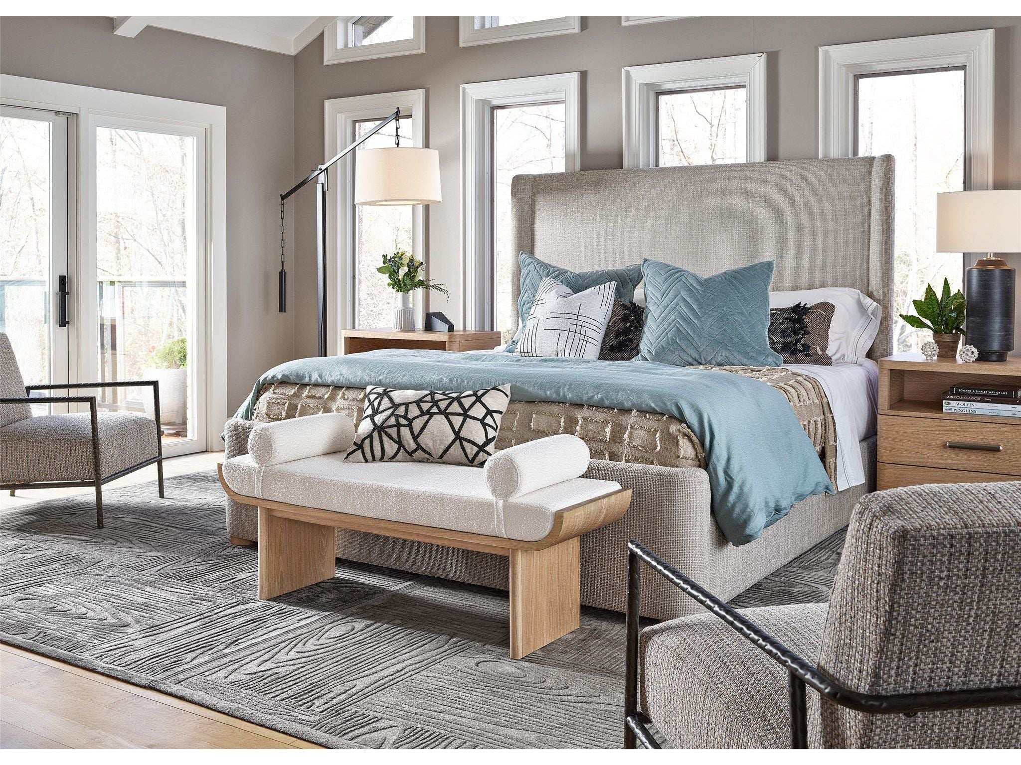Artistic and appealing, the Sischo Bench adds layers of texture and inspired aesthetic to any home space with an upholstered body, a fresh oak-finished frame and removable bolsters.